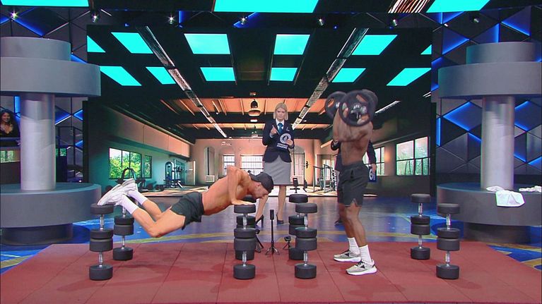 Scott Mathison e Darien Johnson devono fare almeno 10 piegamenti consecutivi con spinta pliometrica lanciandosi un bilanciere.