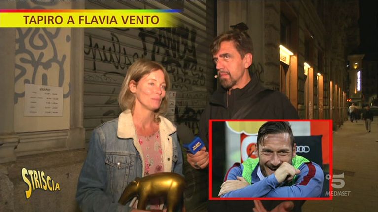 Valerio Staffelli consegna il Tapiro d'oro a Flavia Vento, "vittima" del caso Totti-Blasi. Nel 2005, quando Fabrizio Corona aveva lanciato il gossip di un presunto tradimento del capitano della Roma, un mese prima delle nozze, con la showgirl, nessuno ci aveva creduto. Ma ora che Ilary e Francesco sono protagonisti del divorzio-soap opera del secolo, quel presunto flirt è tornato d'attualità