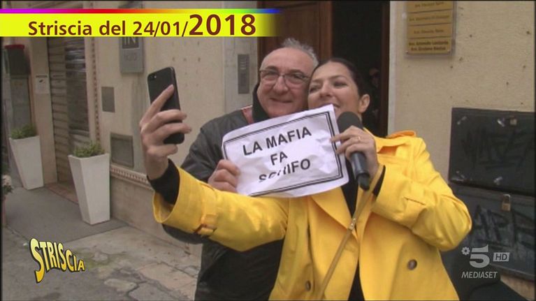 Stefania Petyx è a Castelvetrano, cittadina vicino a Trapani dove il boss MatteoMessina Denaro è nato 60 anni fa: il mafioso, latitante per trent'anni, abitava pocolontano sotto falso nome. Questo è un servizio del 2018: l'inviata ferma i passanti echiede di scattarsi una foto con il suo cartello "La mafia fa schifo". Quanti avranno ilcoraggio di dire sì?