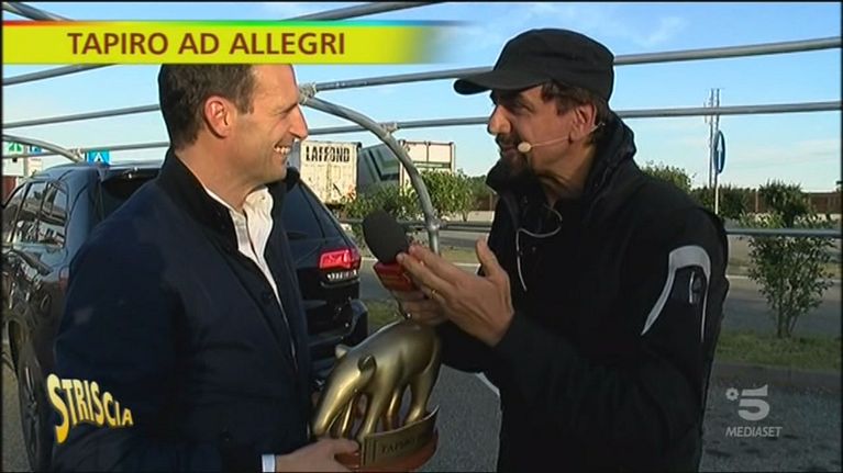 Valerio Staffelli consegna il Tapiro d'oro a Massimiliano Allegri dopo il battibecco con l'opinionista sportivo Daniele Adani che ha portato l'allenatore della Juve a togliersi il microfono e ad abbandonare la postazione durante l'intervista post gara tra Inter e Juventus.